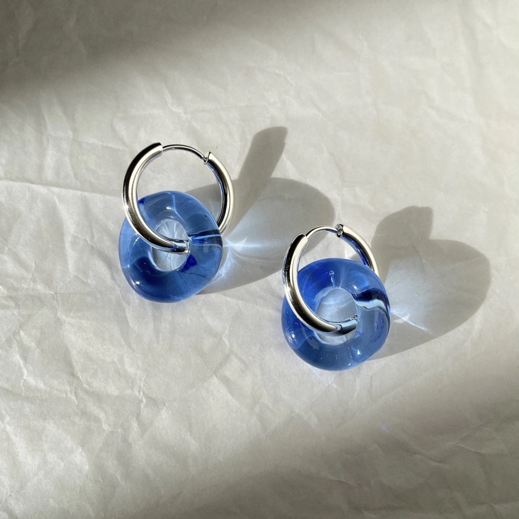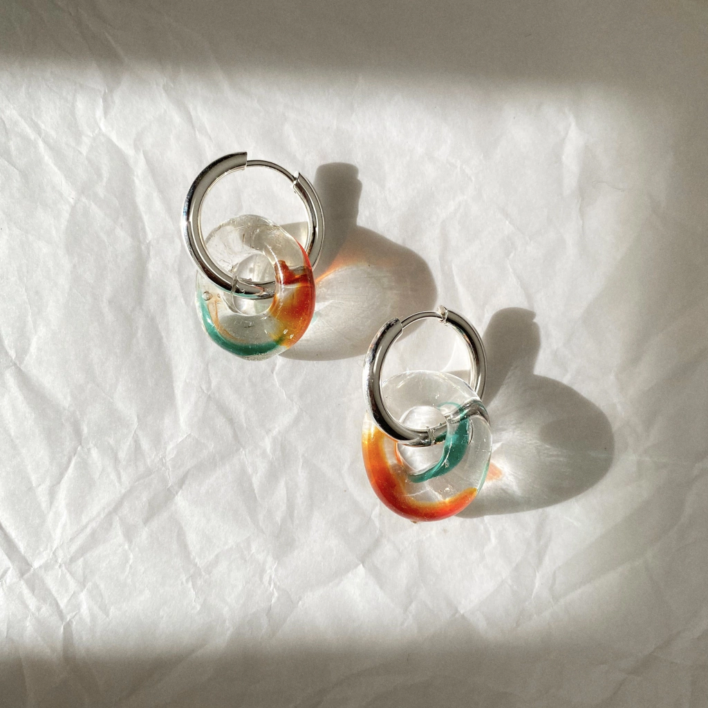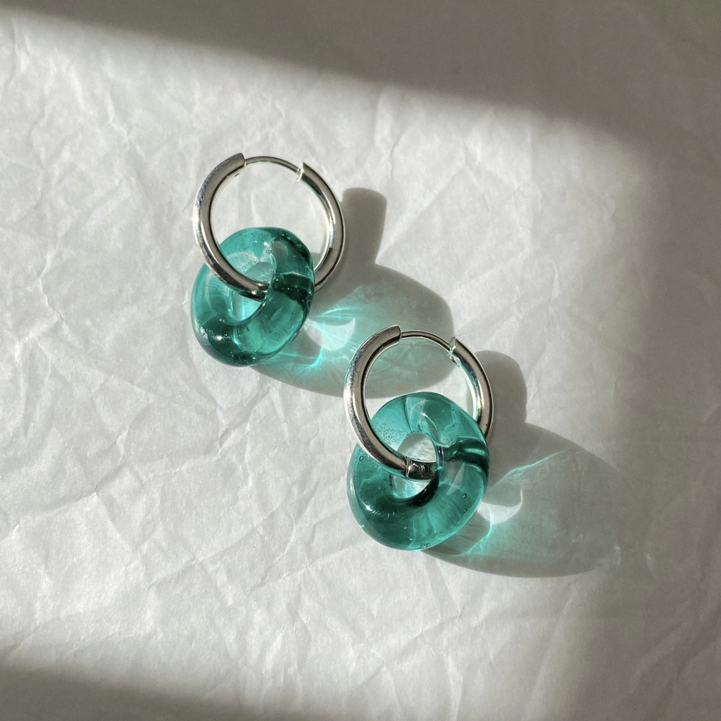 Material: argollas de acero quirúrgico con baño en oro o plata y dijes de vidrio murano confeccionados a mano.