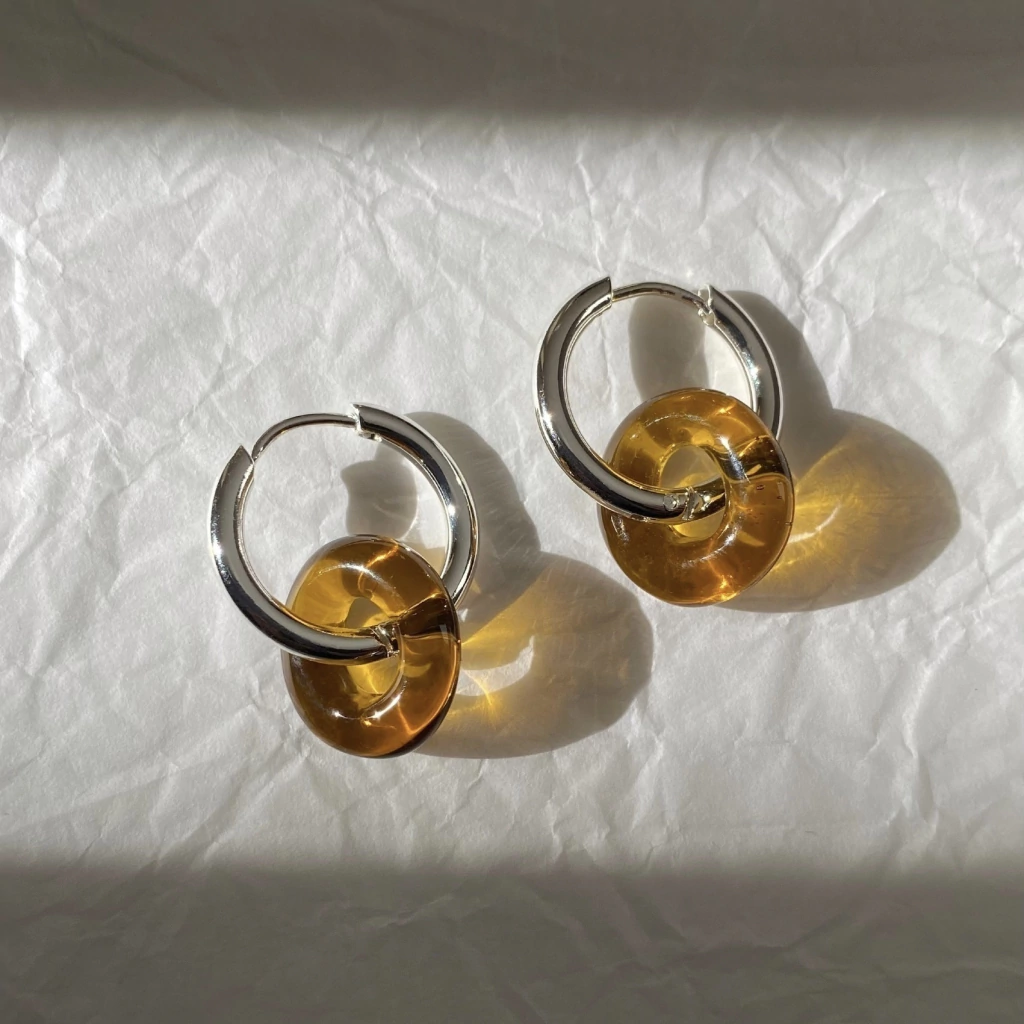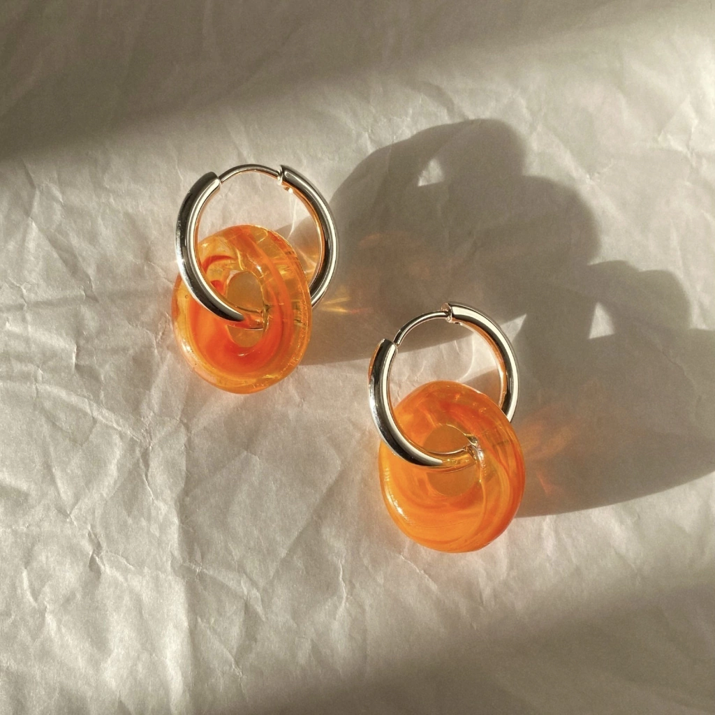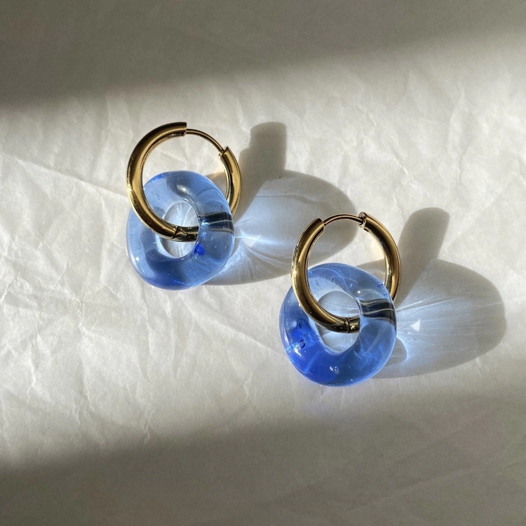 Material: argollas de acero quirúrgico con baño en oro o plata y dijes de vidrio murano confeccionados a mano.