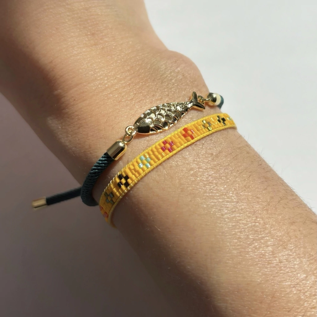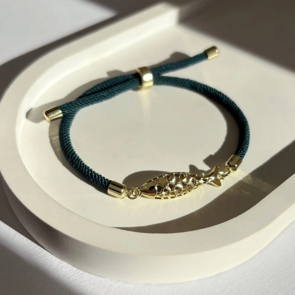 Material: cordón de algodón con terminales bañadas en oro, dije de oro laminado.